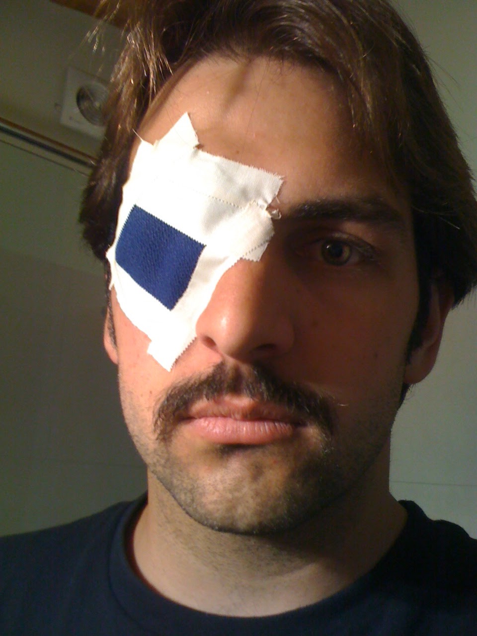 I'm only laughing because it's not a big deal. Bird scat scratched my cornea and I get this awesome MacGyver eye patch for 48hours and no swimming for 3-4 days at most. I don't have to play against the easy team tomorrow (kalamaki for those of you tracking) and I'll be back just in time for the hard game Wednesday (panathanaikos).
